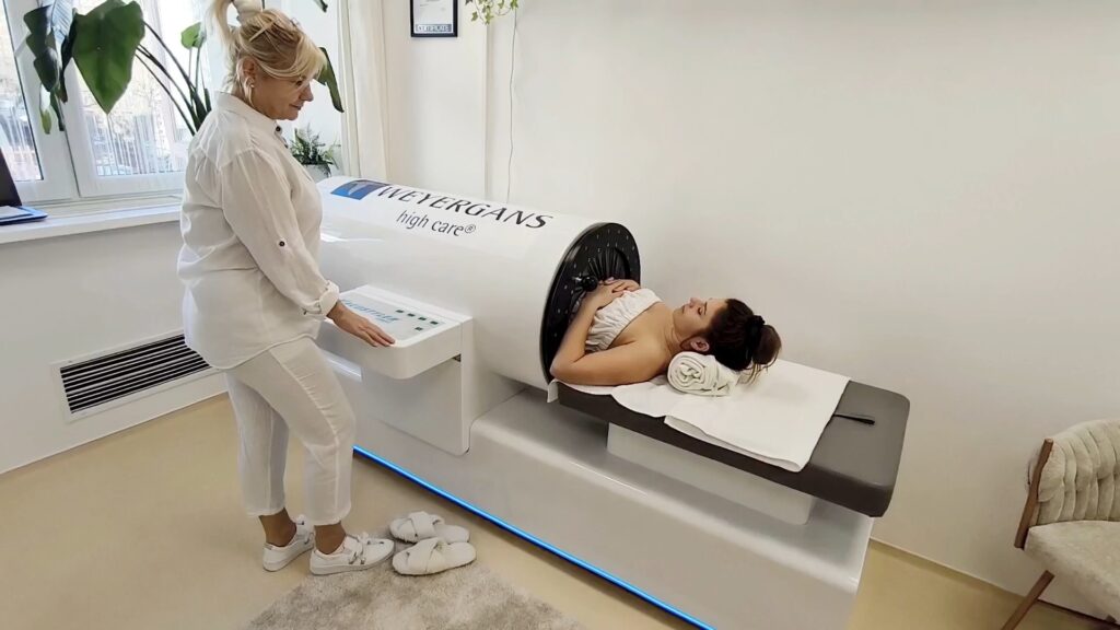 A vendég a hátán fekszik, kényelmes pozícióban, fájdalom és kellemetlen érzet nélkül, miközben a készülék végzi a munkát.